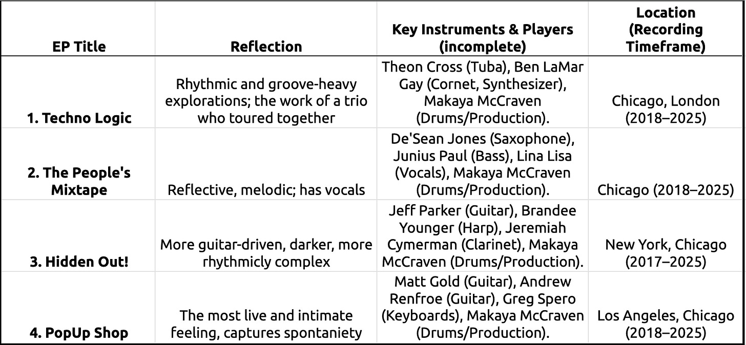 The album brings together four EPs (Techno Logic, The People’s Mixtape, Hidden Out!, and PopUp Shop) recorded over several years, primarily using the “sampling the spontaneous” process (recording hours of live improvisation and then chopping/remixing them in the studio). Here’s one way to start to break them down: